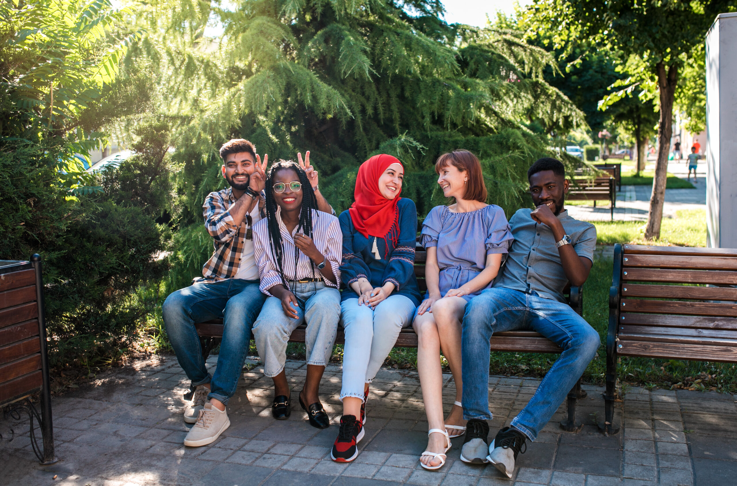 AdobeStock_275649625-300x198 Multiracial young friends sitting by the street and having fun.